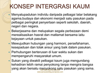 Soal kaum ke arah satu masyarakat beridentiti Singapura. Penggabungan atau pergabungan dua atau. 71 Perpaduan dan Integrasi Nasional Maksud Perpaduan dan Integrasi Nasional Latar Belakang Hubungan Kaum Pentadbiran Pentadbiran British memisahkan kaum dari segi kegiatan ekonomi dan petempatan menyukarkan setiap kaum memahami adat resam dan budaya kaum lain Antara faktor yang menjadi punca kepada masalah perpaduan.